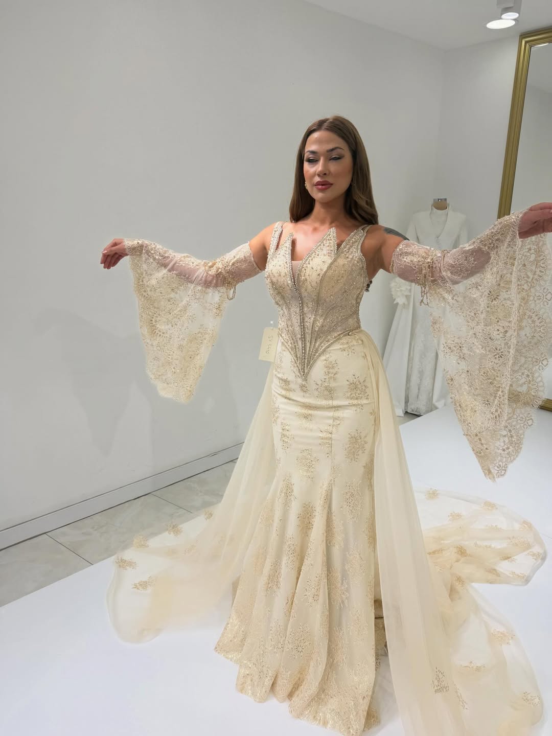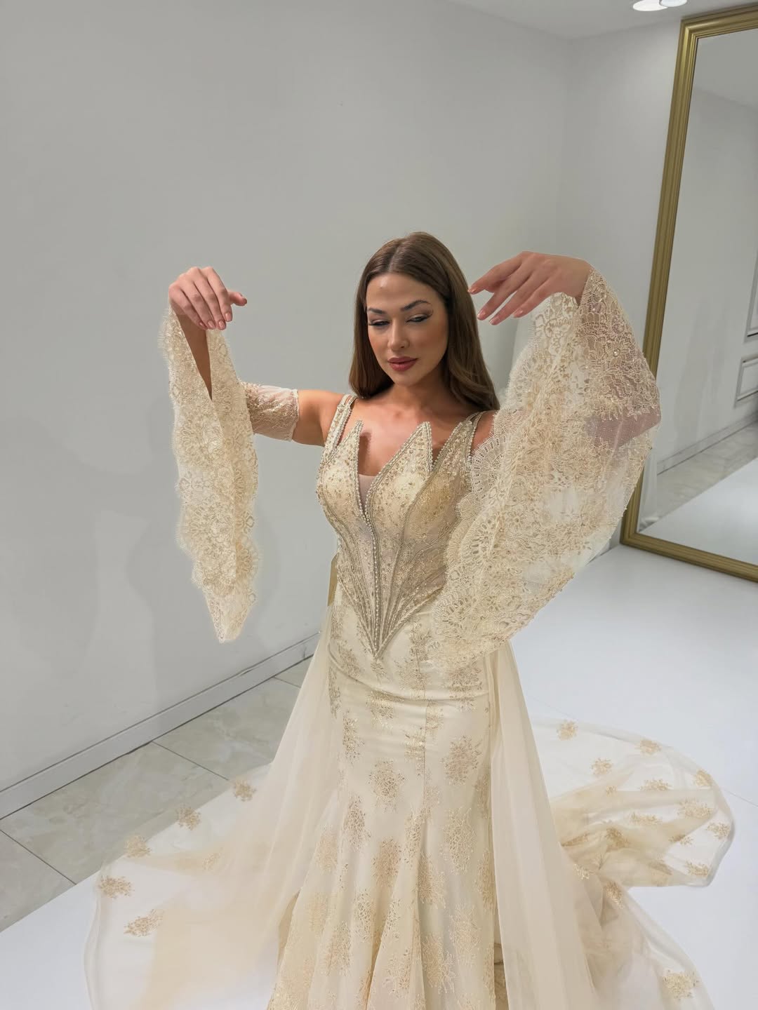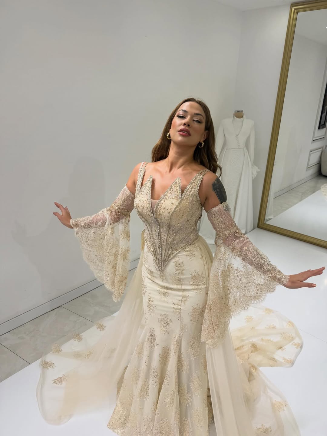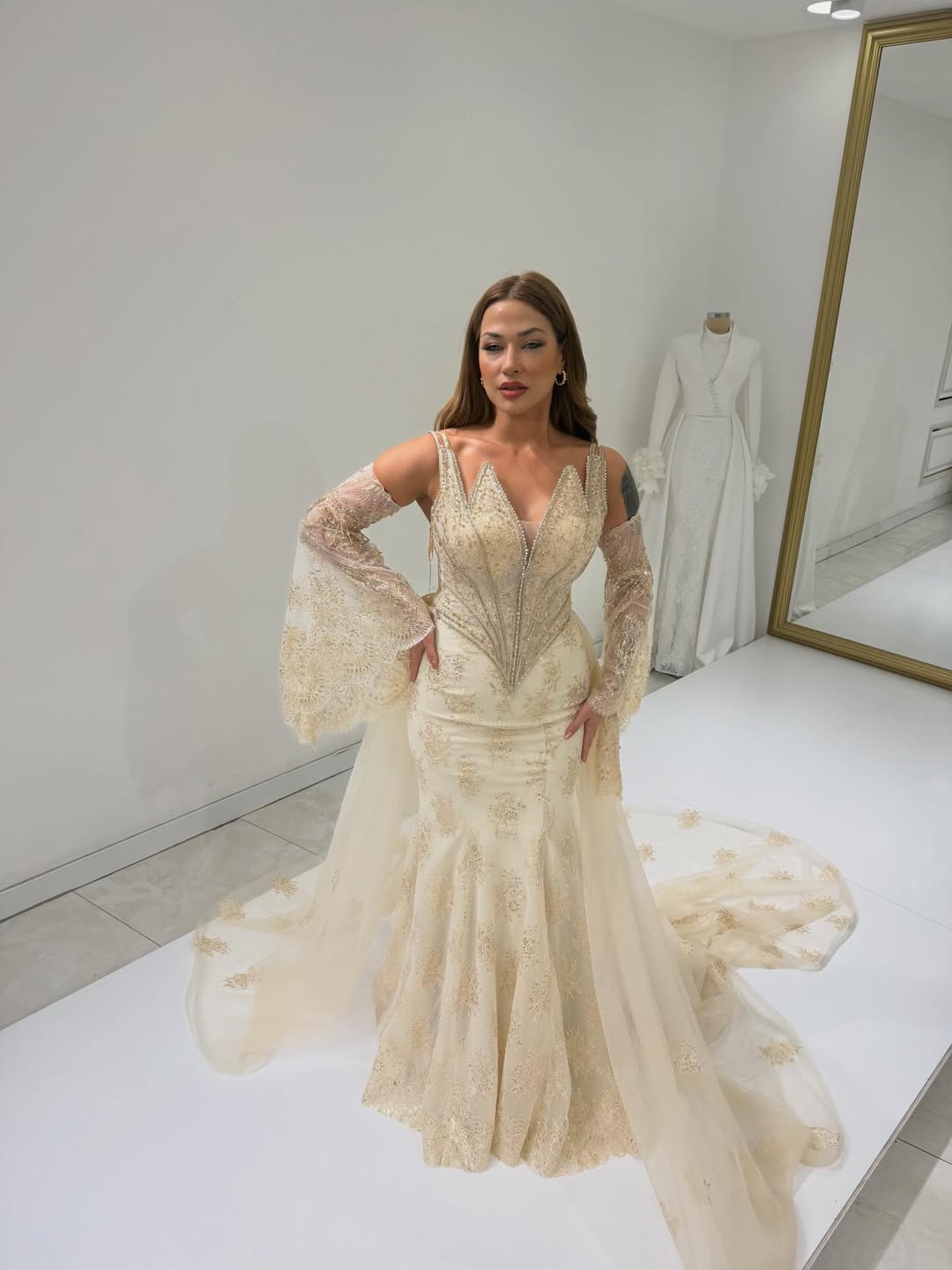 Bu nişan elbisesi, hem ihtişamı seven hem de zarafetten vazgeçmeyen gelin adayları için biçilmiş kaftan. Altın tonların verdiği ışıkla parlayacak, korsajın feminen etkisiyle kendini güçlü hissedecek ve o özel gecede adeta bir tanrıça gibi görüneceksin. ✨