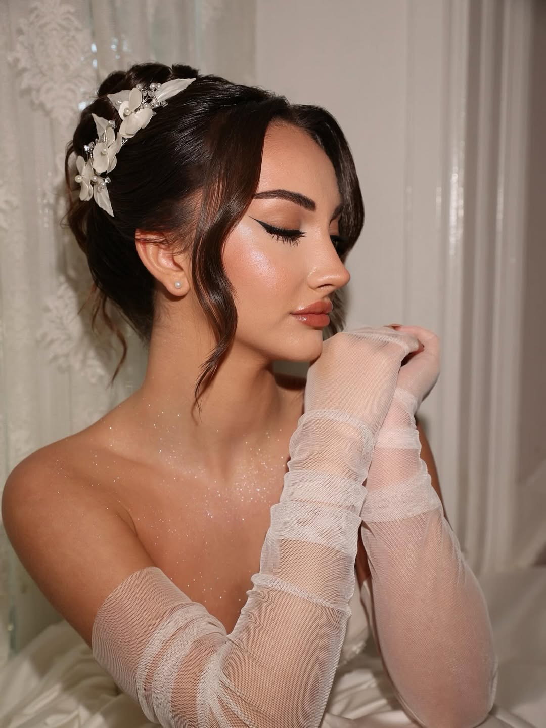 Doğal ışıltılı cilt ve net göz makyajı, gelinliğin feminen havasını güçlendiriyor.