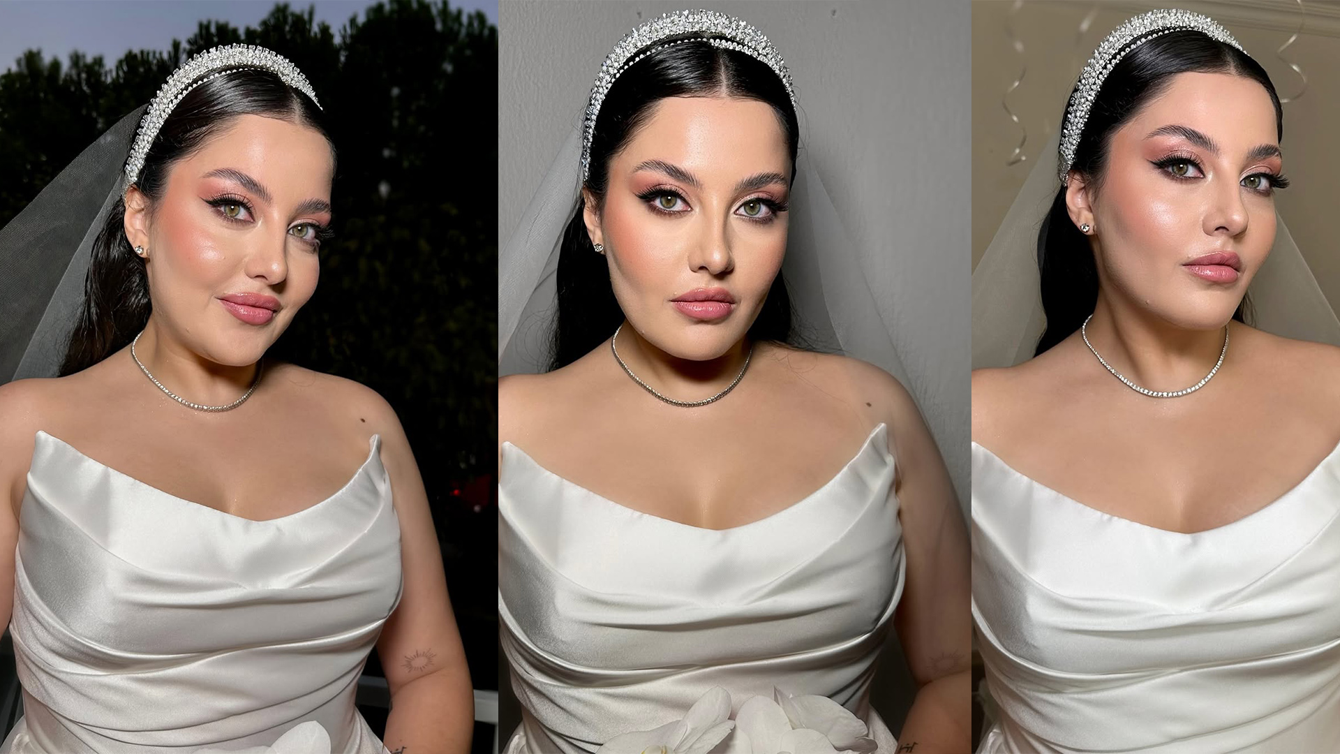 Derya Şimşek, ışıltılı göz makyajını doğal tonlarla dengelerken, dudaklarda hafif bir parıltı ile görünümü tamamlamış. Özellikle modern tarzda bir düğün planlayan gelinlere ilham verecek bu makyaj, kusursuz bir estetik sunuyor.