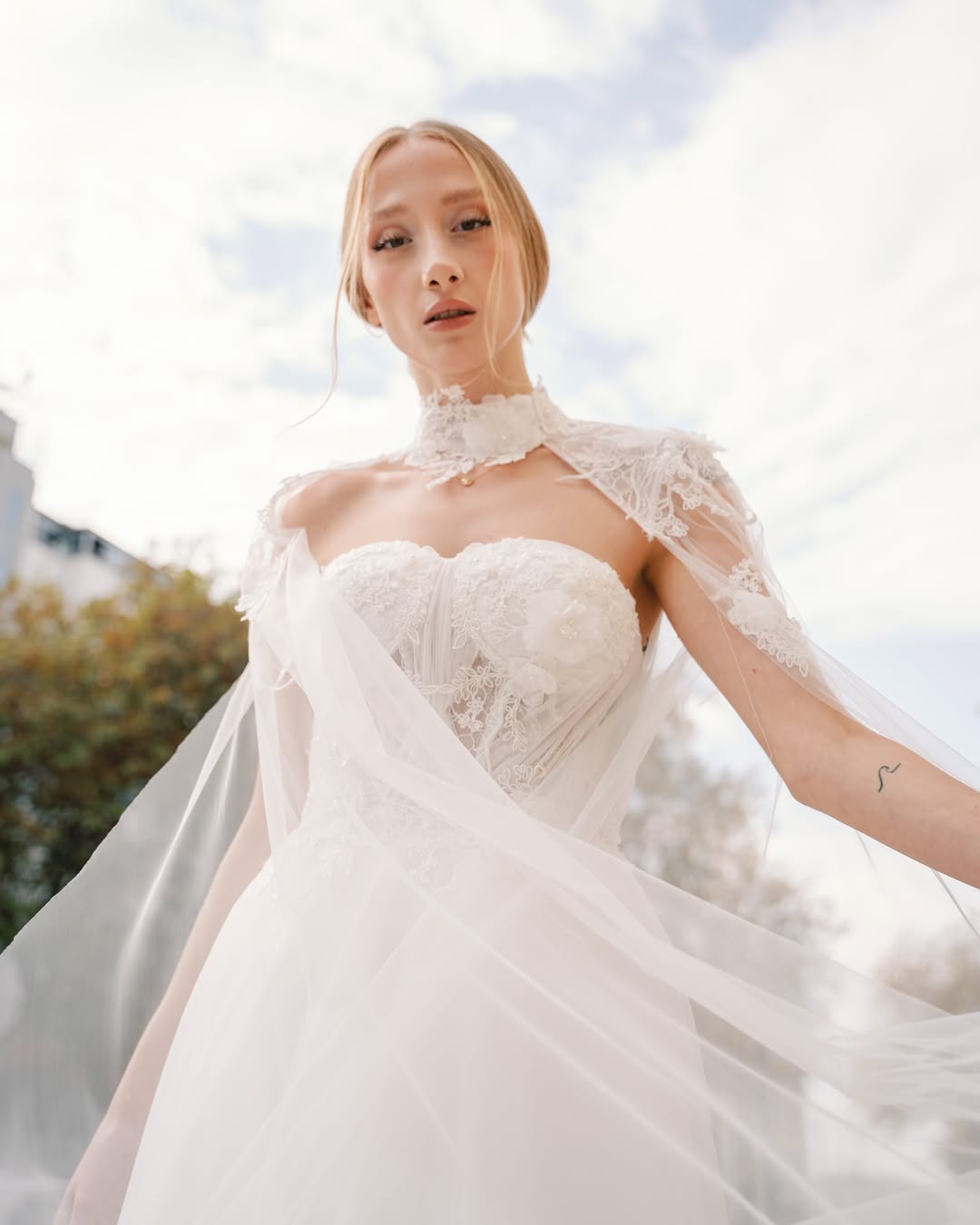 Cape görünümü veren tül detay tasarımı sıradanlıktan çıkarıp editorial bir şıklığa taşıyor.