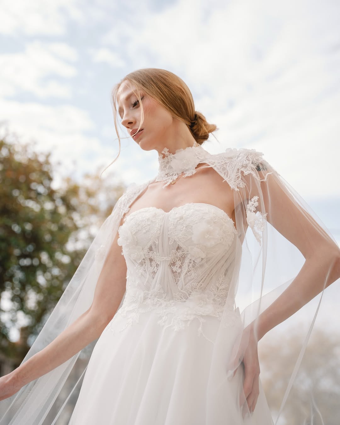 Bu gelinlik tam anlamıyla romantik-modern bir tasarım. Yumuşacık bir tül akışı, üst bedendeki üç boyutlu dantel dokular ve zarif cape görünümü… Hepsi bir araya gelince peri masalı etkisi yaratıyor.