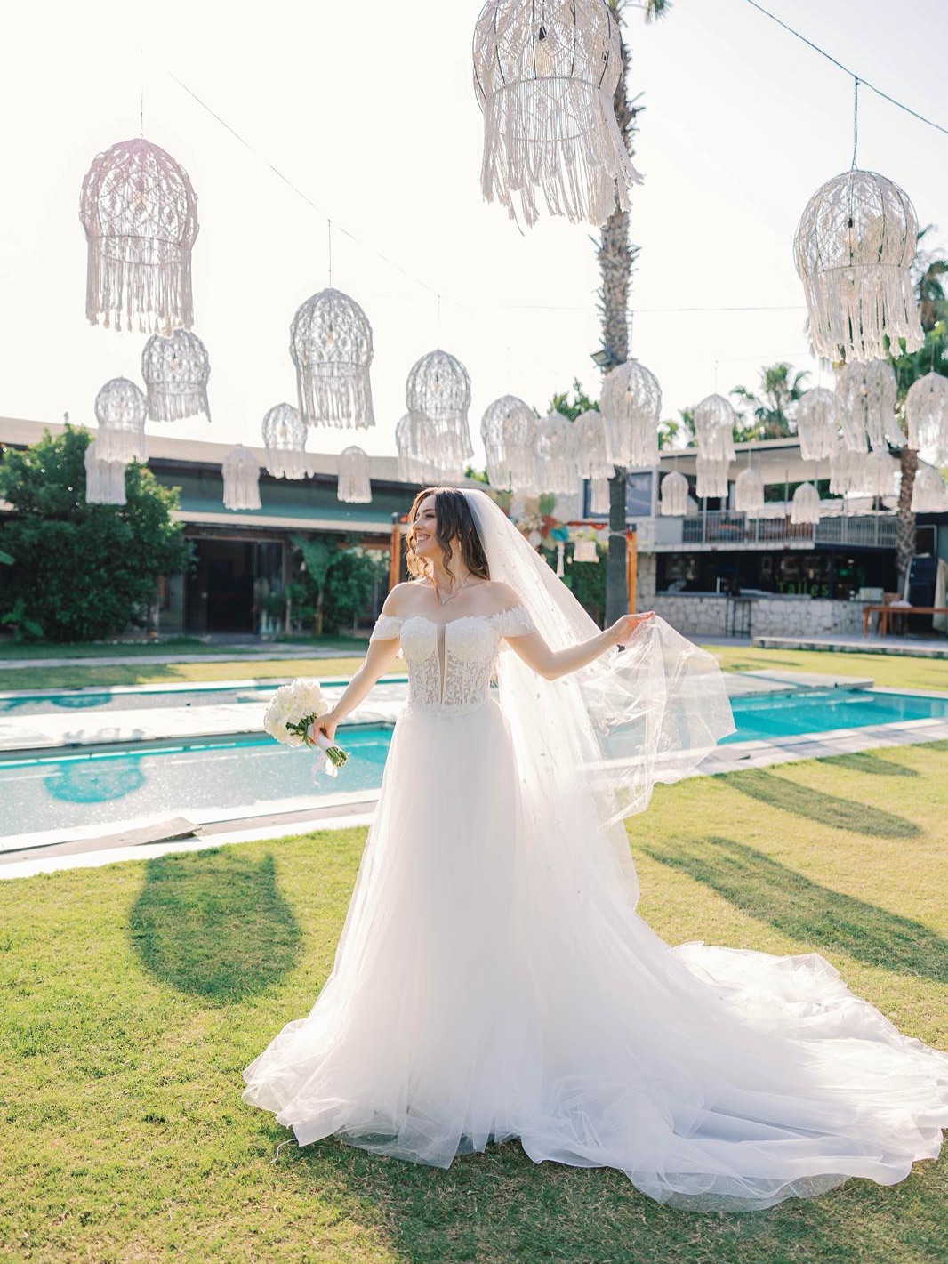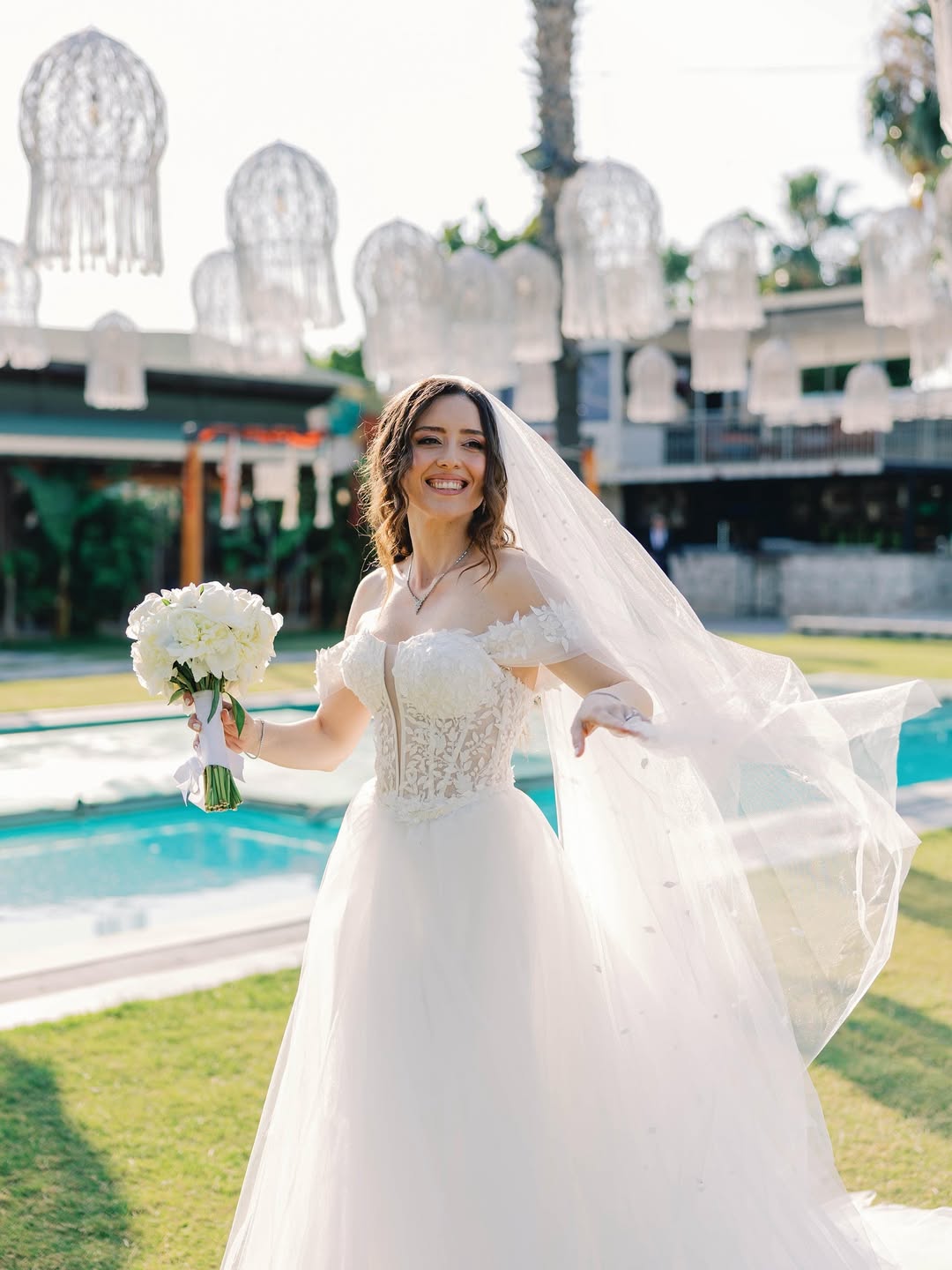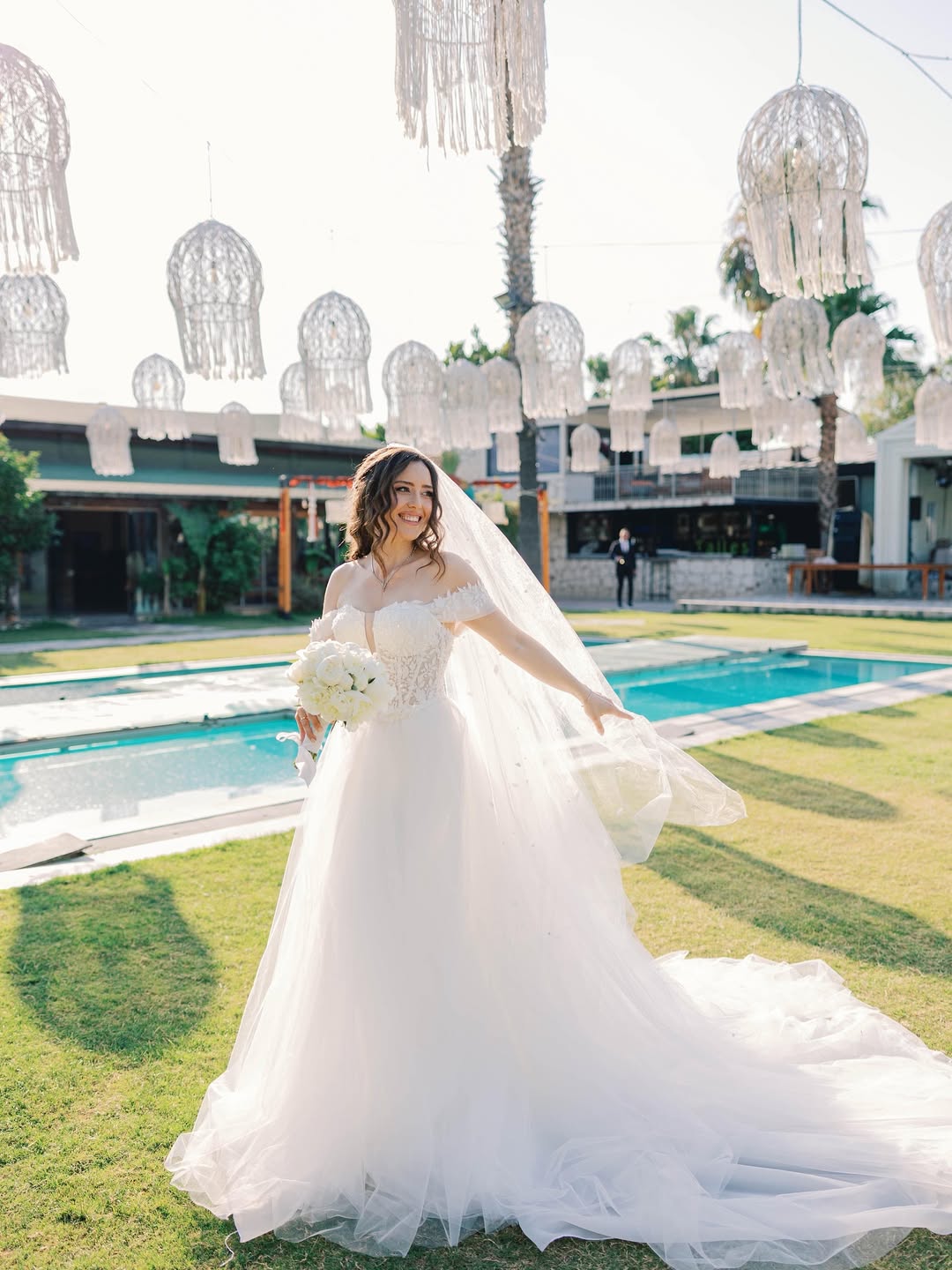 Bu gelinlik en çok zarif, doğal ve romantik pozları seviyor. Gelin buketin hafif, sade olması da dengeyi güçlendirir.
