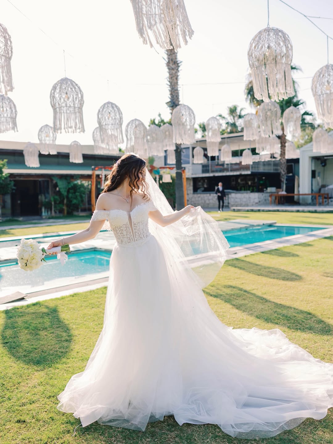 Bu gelinlik tam anlamıyla “romantik gelinin kalbinden kopmuş gibi”… Hem omuzların zarifçe ortaya çıkıyor, hem de tül eteklerin o hafif bulutumsu dokusu seni adeta süzülüyormuşsun gibi gösteriyor. Gelin koçun olarak söylemeliyim: Bu model, kendini hem prenses gibi hissetmek hem de modern bir duruş sergilemek isteyen tüm gelinlere güçlü bir ilham taşıyor! 🌿💫