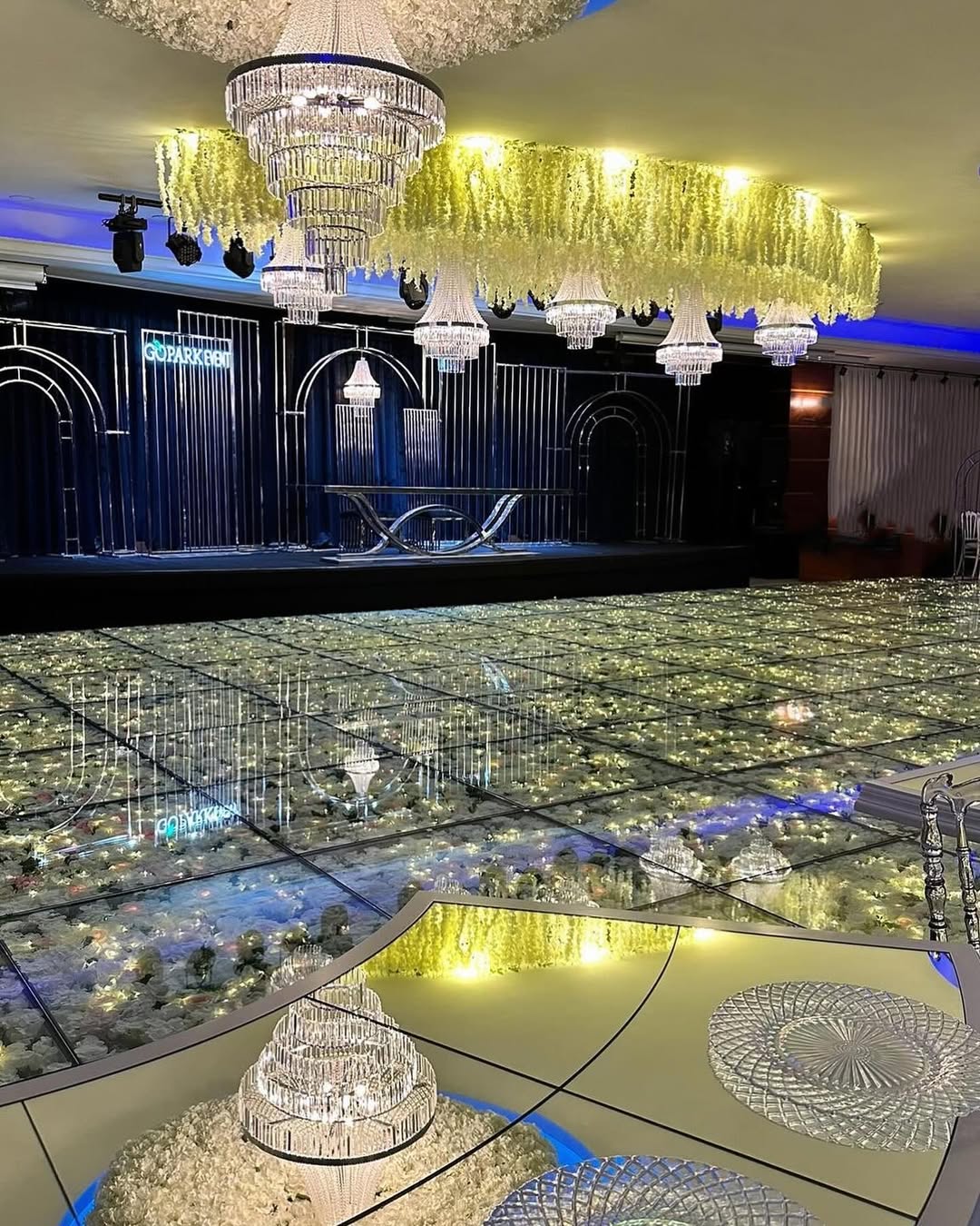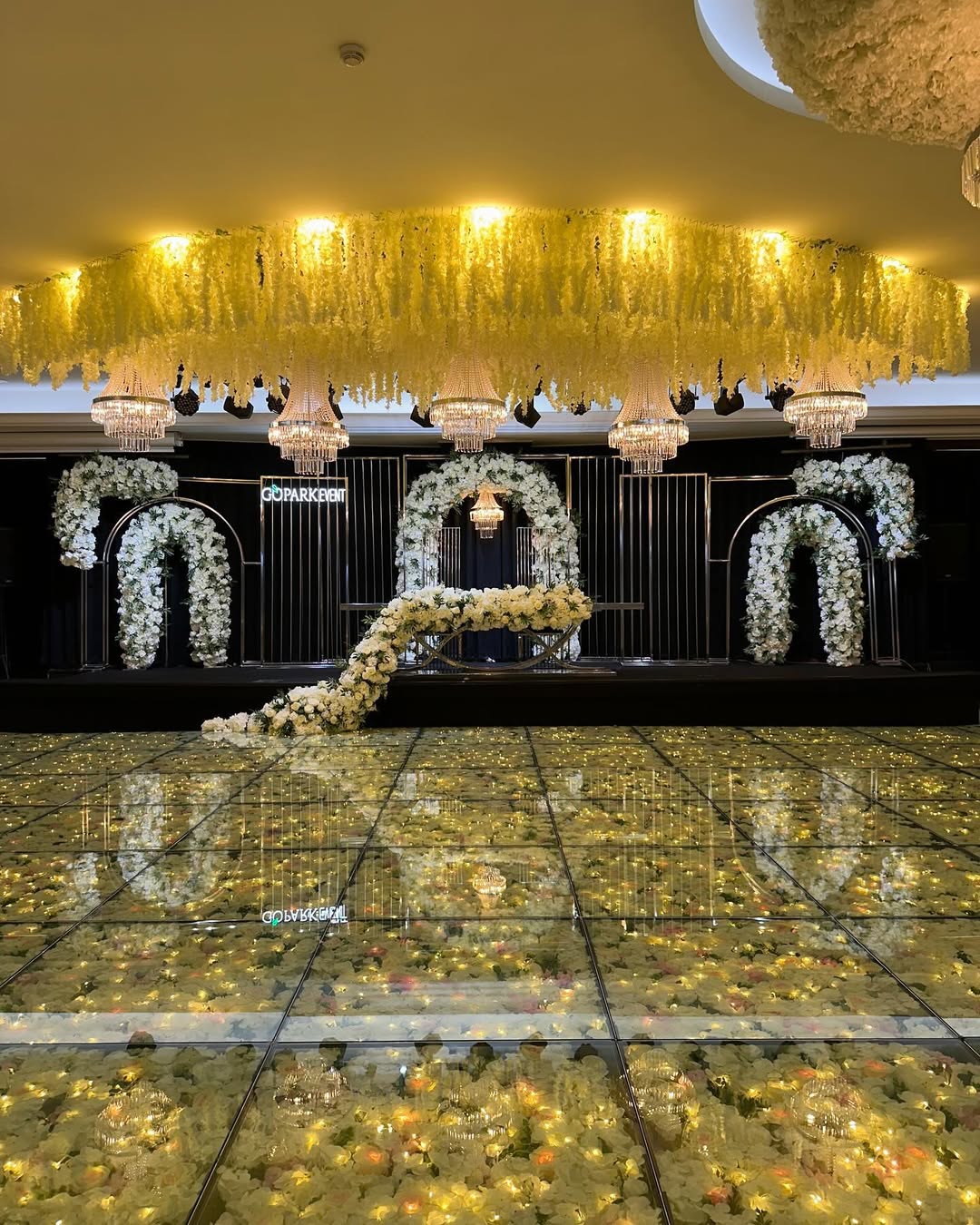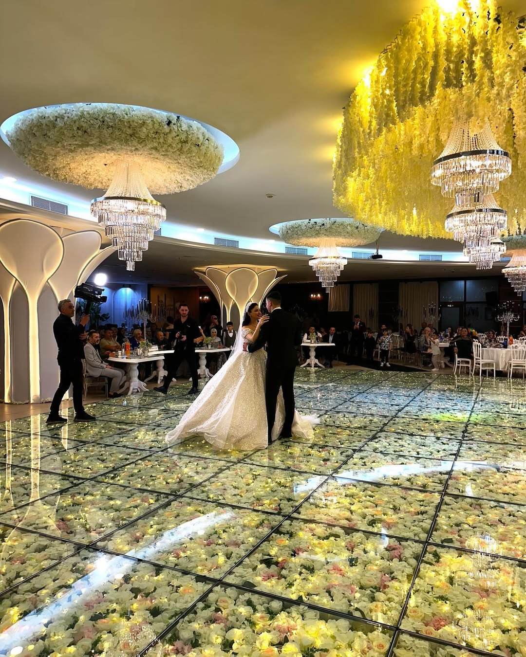 Fotoğraflarda ilk göze çarpan detaylardan biri, mekânın cam zeminli ve içi çiçeklerle aydınlatılmış dans pisti. Bu detay, düğün boyunca fotoğraf ve videolarda masalsı bir etki yaratıyor. 🌸✨