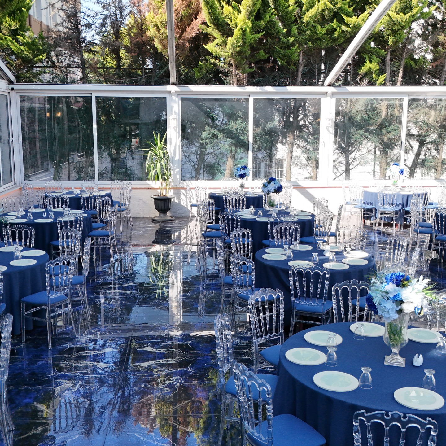 Yuvarlak masalar, koyu lacivert ve siyah masa örtüleriyle daha sofistike bir atmosfer yaratıyor.