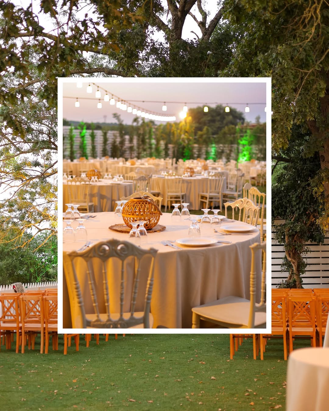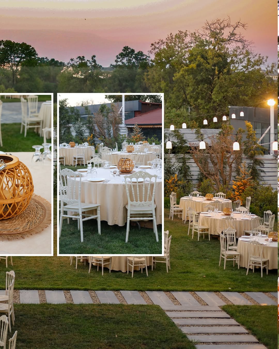 Hasır fenerler, doğal ip detaylar ve soft aksesuarlar bohem dokunuşları güçlendirirken; ağaçlar arasına asılan sıcak tonlu sarkıt ışıklar akşam davetlerinde masalsı bir ambiyans oluşturuyor.
