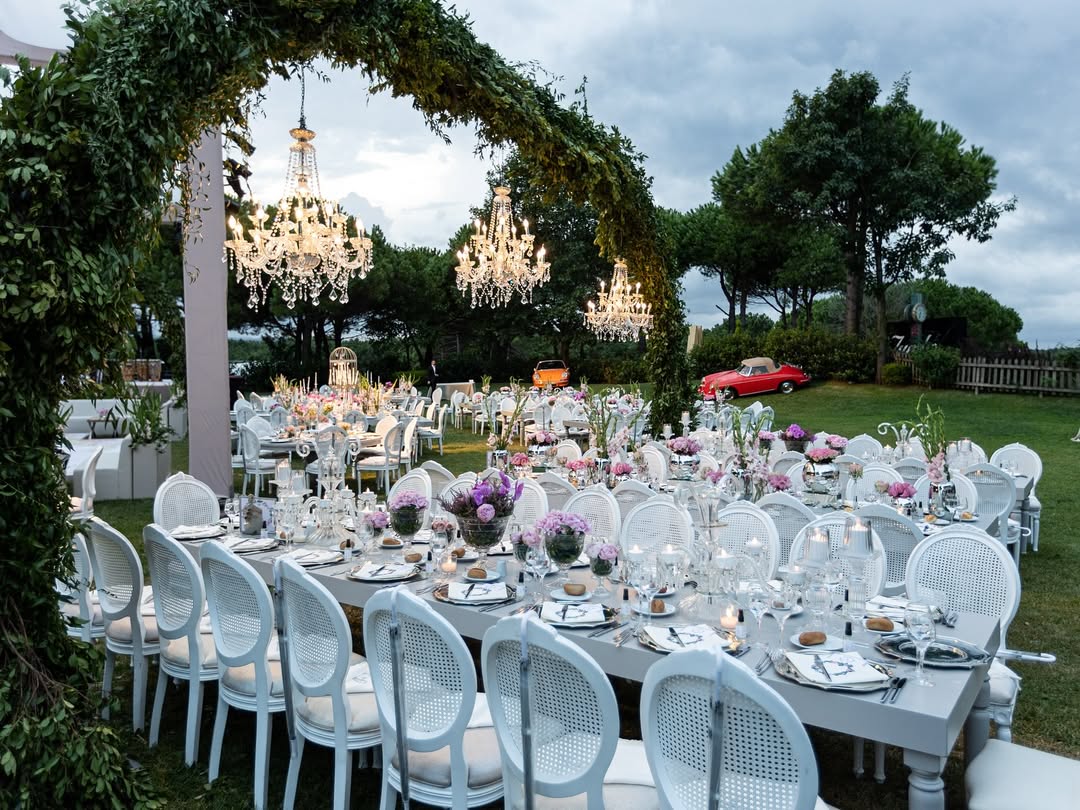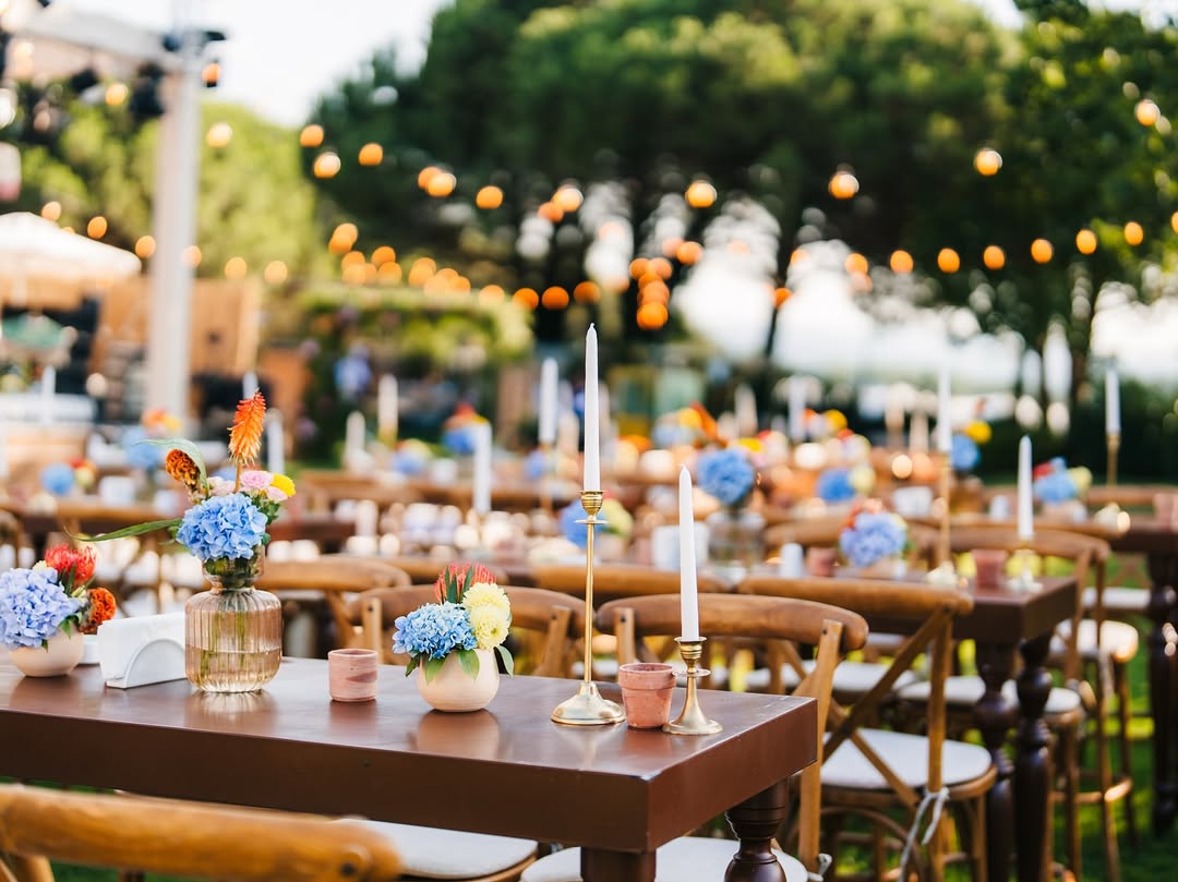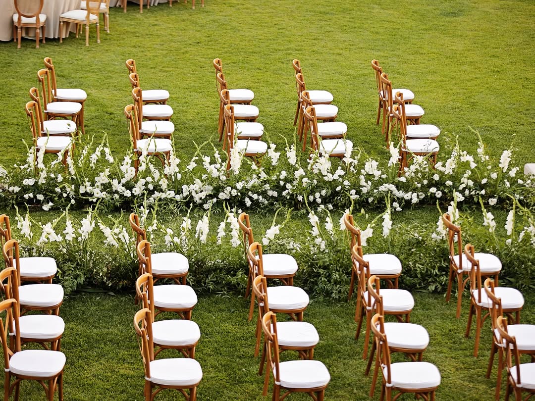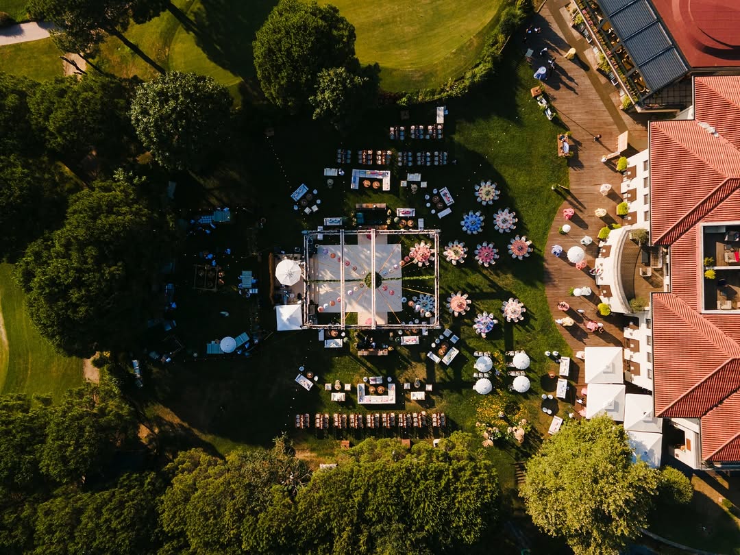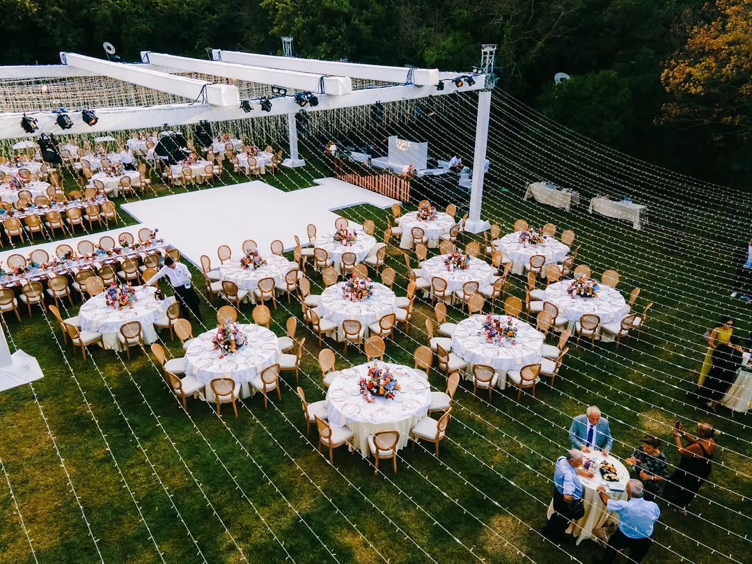 Geniş çim alanlar üzerinde kurulan yuvarlak ve dikdörtgen masa düzenleri, mekâna ferah ve dengeli bir görünüm kazandırıyor.