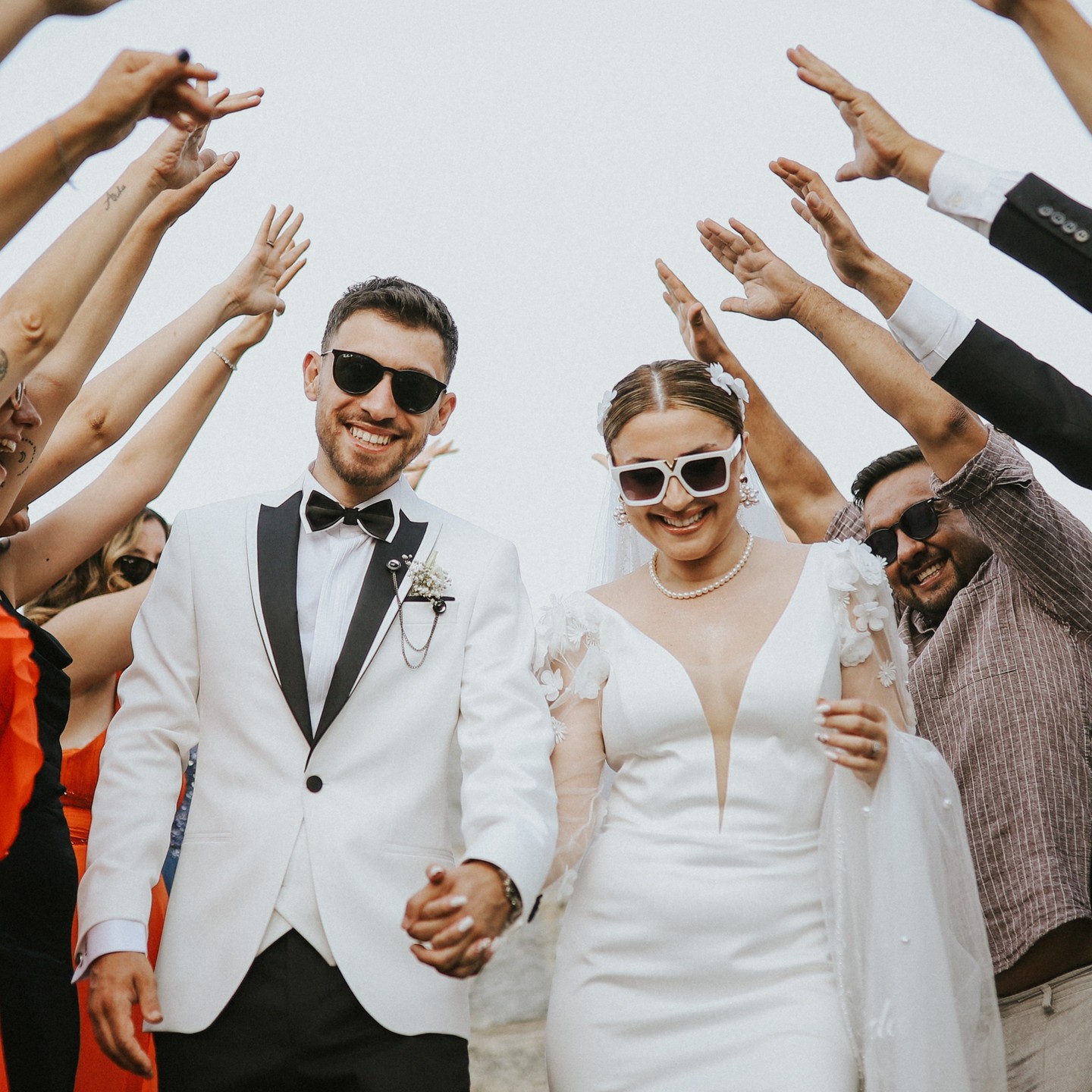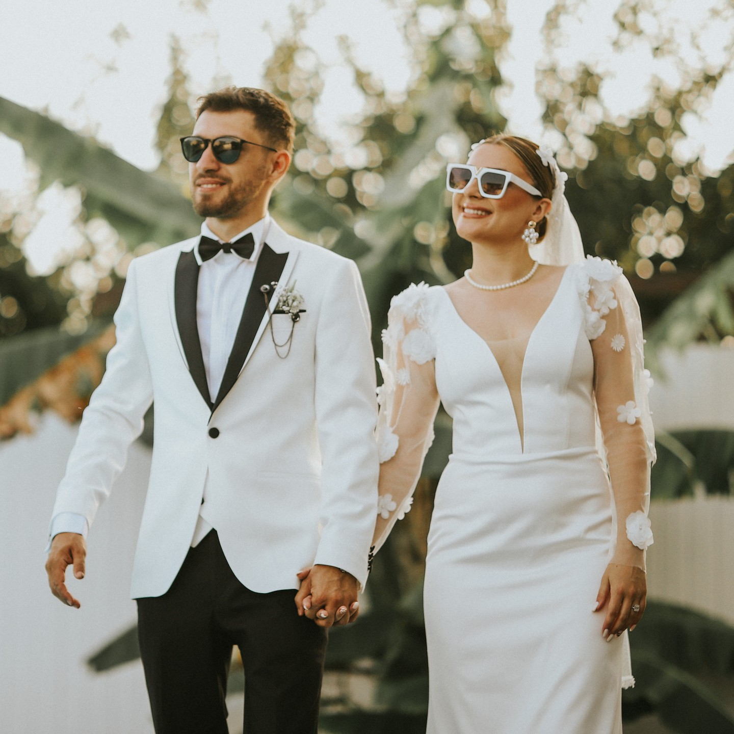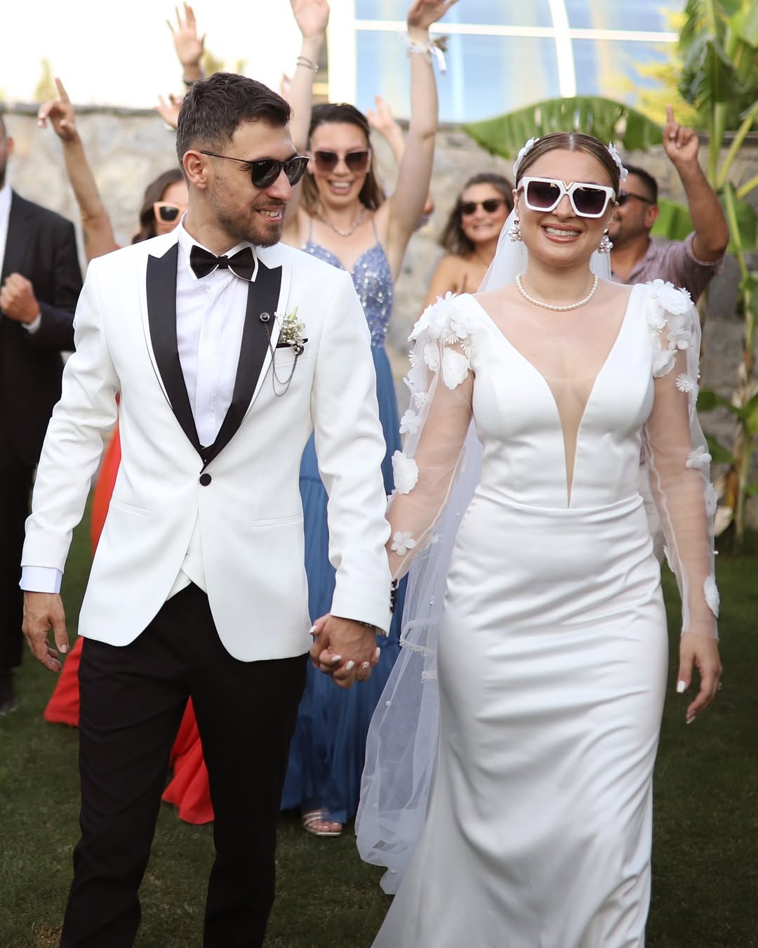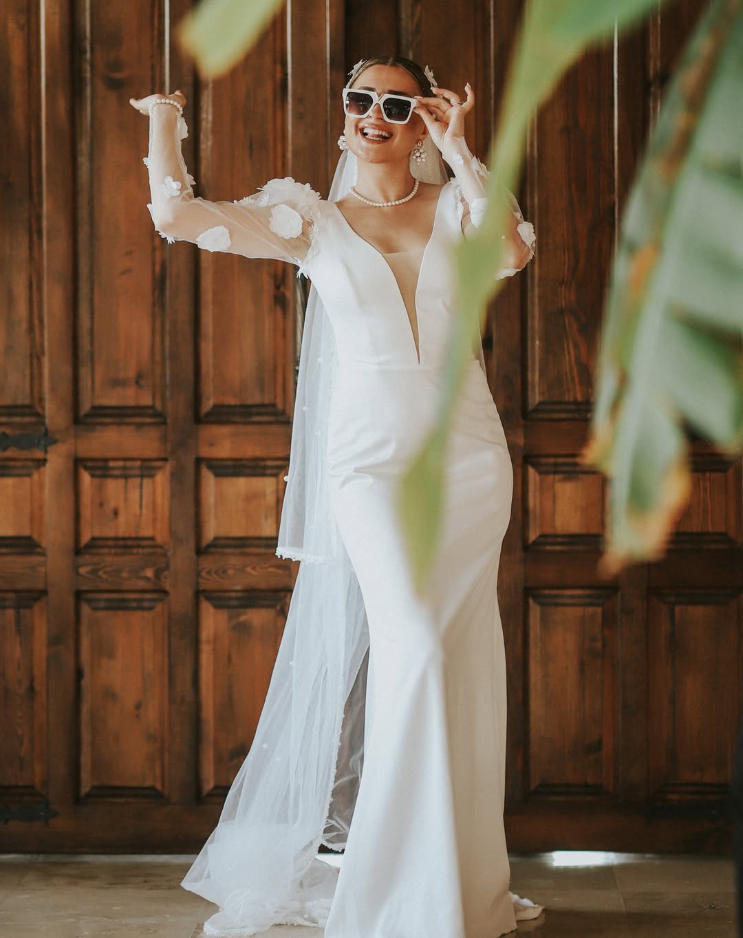 ✔ Güneş gözlüğü gibi modern dokunuşlar gelinliğe cool bir hava katar.