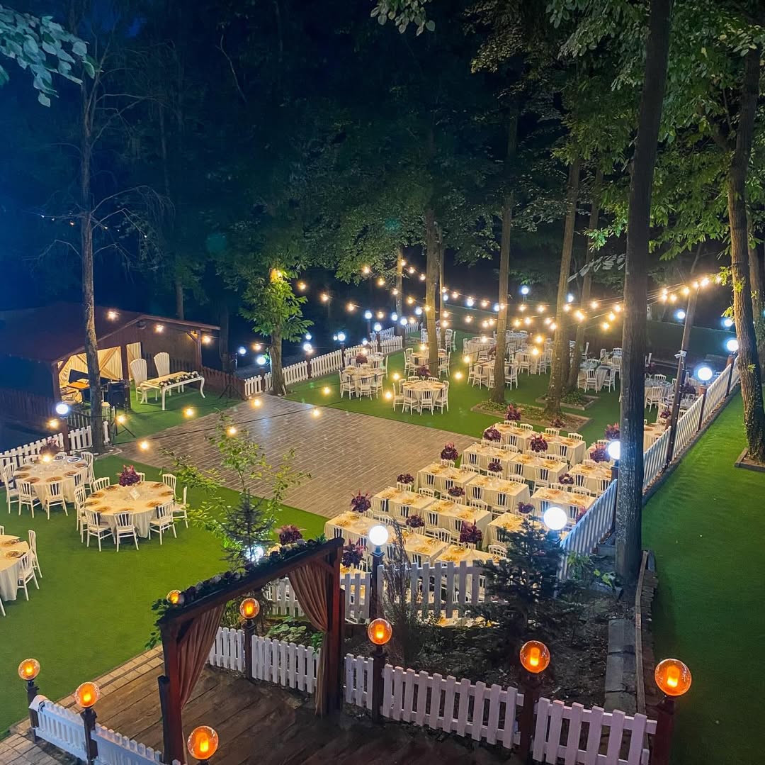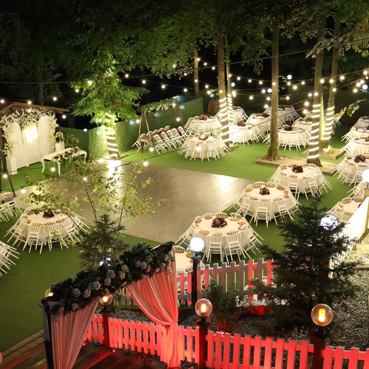 Ağaçlar arasına asılan sıcak sarı string ışıklar, akşam organizasyonlarında masalsı bir etki yaratıyor.