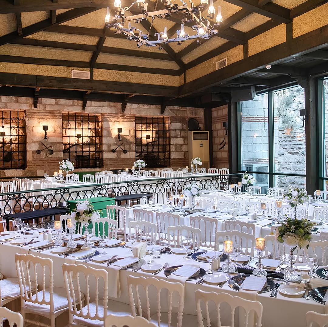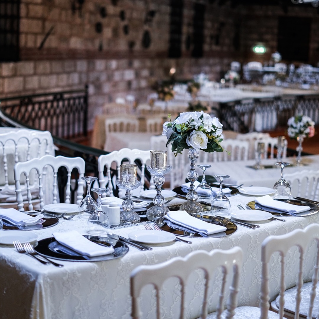 • Uzun dikdörtgen masalar beyaz napolyon sandalyeler ile kombinlenmiş; bu düzen kalabalık davetlerde bile düzenli ve zarif bir görünüm sağlıyor.