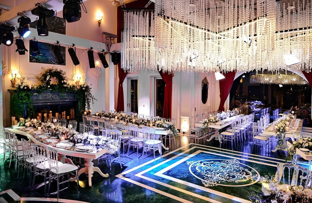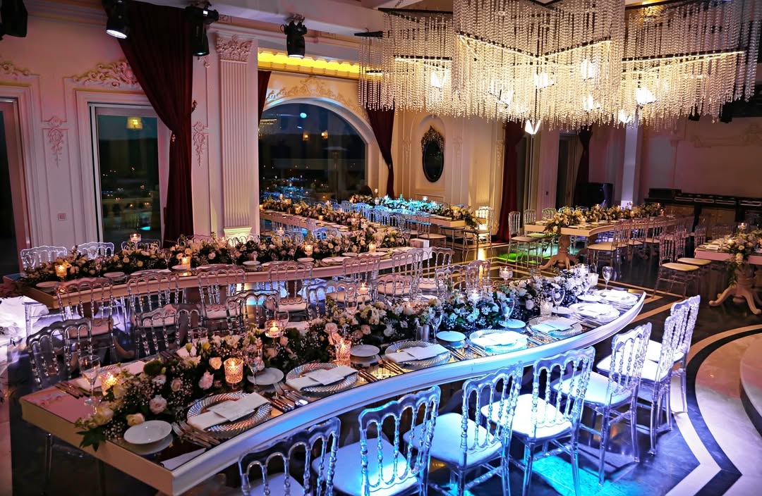 Uzun masa düzenleri, şeffaf chiavari sandalyeler ve yoğun çiçek yerleşimleriyle modern–klasik bir denge kurulmuş