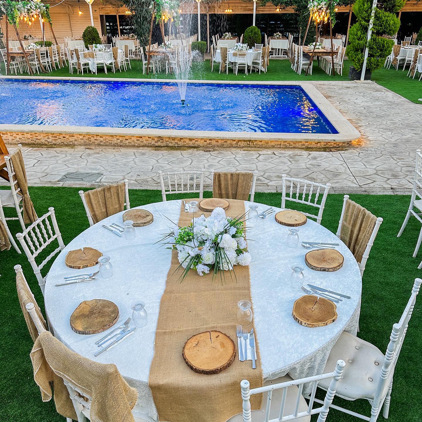 Fotoğraflardan net şekilde görüldüğü üzere Talia Garden’da rustik–bohem bir dekorasyon dili hâkim. Ahşap uzun masalar, yuvarlak davet masaları, jüt runner’lar, kütük suplalar ve beyaz napolyon sandalyeler mekânın doğal şıklığını tamamlıyor.