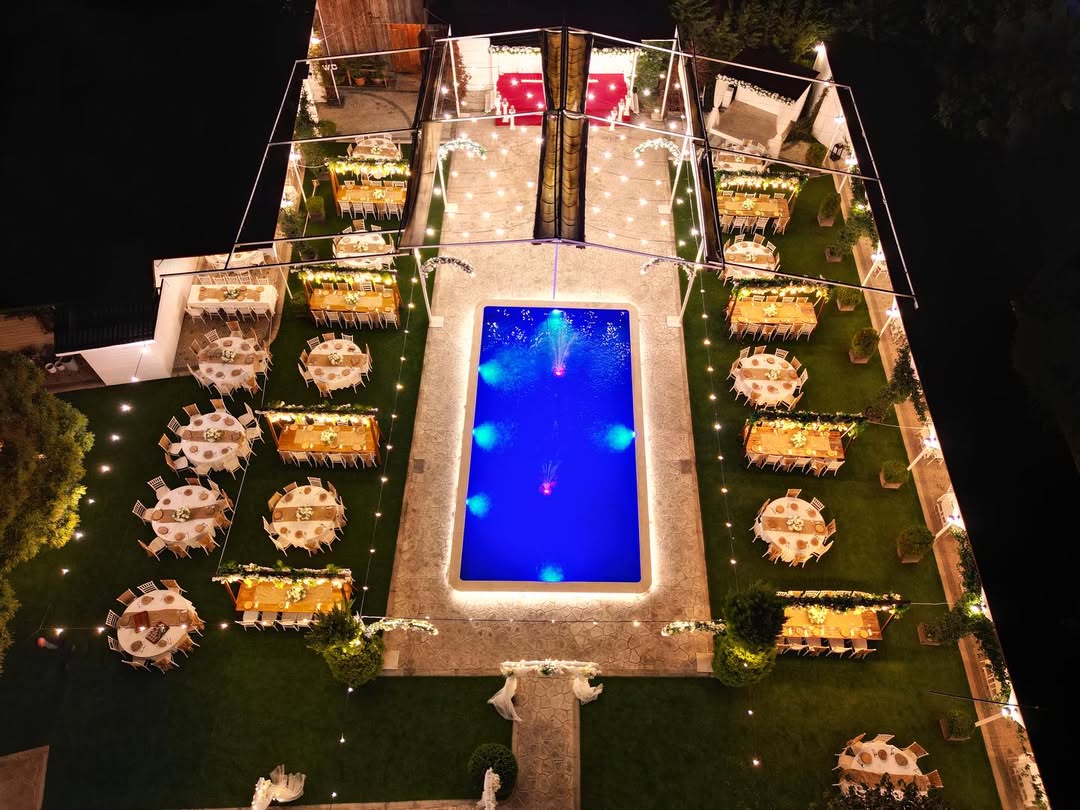 Işıklandırma sıcak tonlu olduğu için özellikle akşam ve gece düğünlerinde romantik, soft ve davetkâr bir atmosfer oluşuyor. Havuzun mavi rengi ise mekâna ferahlık ve görsel derinlik katıyor.