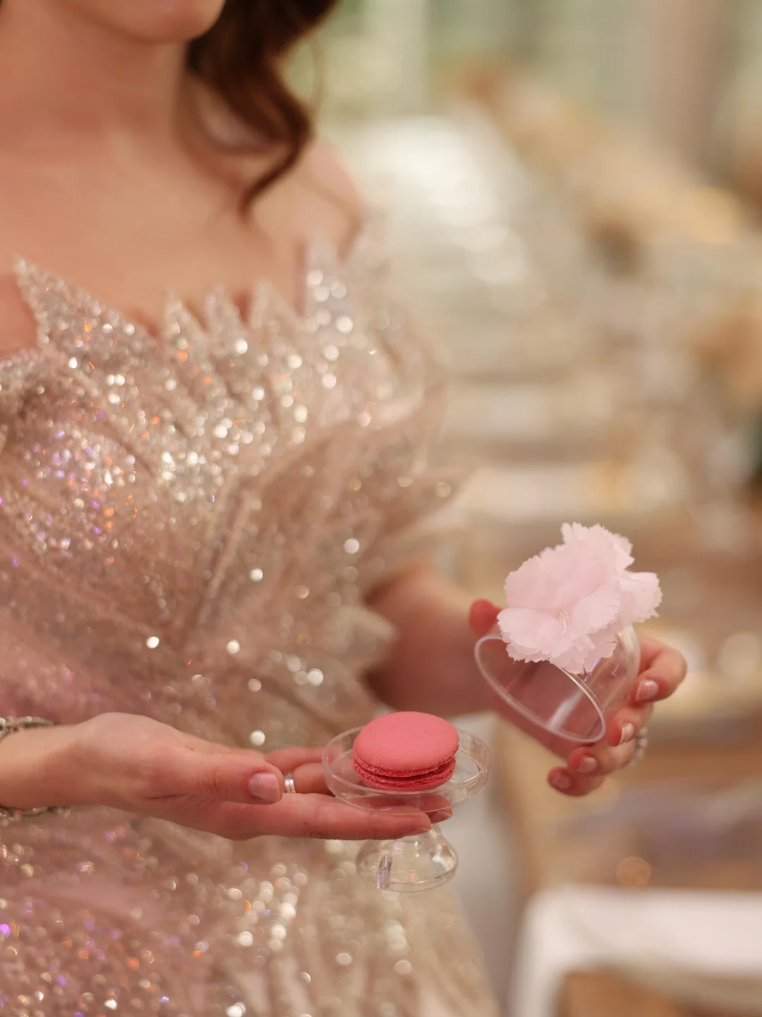 Elbise zaten oldukça iddialı olduğu için, sade bir saç tokası ve zarif bir bileklik yeterli oluyor. Aşırı aksesuar kullanmana gerek yok — ışıltıyı elbisen zaten veriyor!