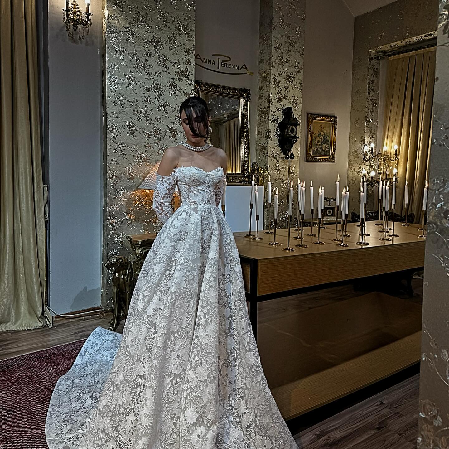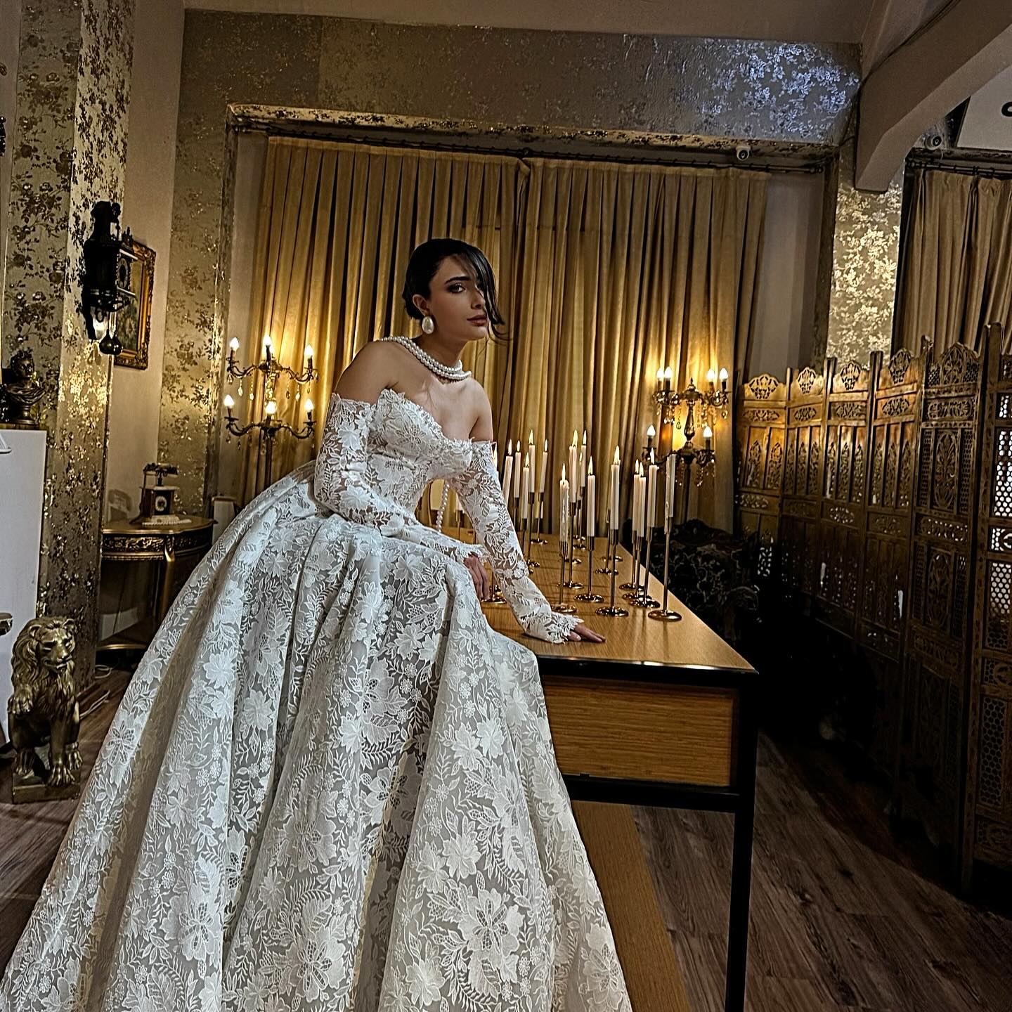 Gelinliğin tamamına yayılan yoğun ama dengeli dantel dokusu, bu modeli özel kılan en güçlü detay. Düşük omuzlu tasarım ve transparan uzun dantel kollar, feminenliği çok zarif bir şekilde vurguluyor. Yakından baktığında dantelin üç boyutlu etkisini ve eteğin akışkanlığını net şekilde görebiliyorsun. Korsaj kısmı bedeni nazikçe sararken, etek hacmi adeta yere süzülüyor.